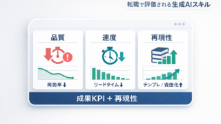 生成AIスキルは転職でどこまで評価される?「使えるだけ」では差がつかない理由と、評価される実績の作り方を解説。品質・速度・運用のKPI、チェックと評価観点、90日ロードマップ、職務経歴書・面接で刺さる言語化と回答例、年収交渉の根拠まで具体的にまとめます。