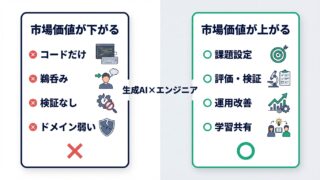 AI・仕事スキル 生成AI時代に市場価値が下がるエンジニアの特徴 生成AIの普及で市場価値が下がりやすいエンジニアの共通点を7つに整理。コーディング偏重、AI出力の鵜呑み、検証不足、ドメイン理解不足など“評価が落ちる原因”と、90日で巻き返すための具体策・KPIも解説します。 2026.02.06 AI・仕事スキル転職・キャリア